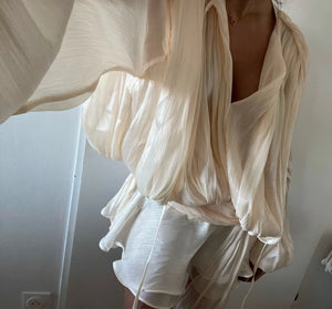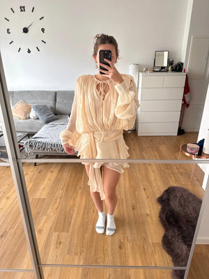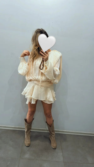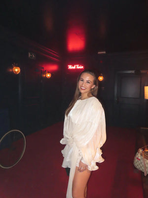 Elegant mini dress with glittery details, bold shoulders and a tie at the neck. Pleating and a gathered hem add a feminine touch. Comfortable thanks to the elastic material. Ideal for special occasions. We recommend combining with shorts for greater comfort for taller people.